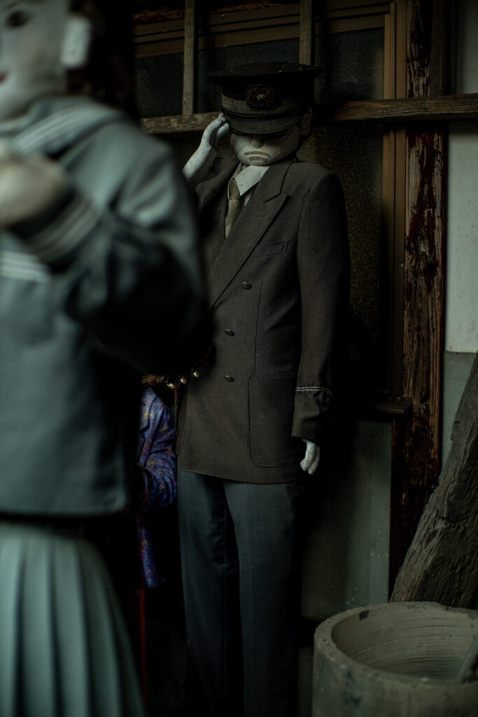 その結果、見る側には独特の違和感が生じる。 一見すると人がいるように見えるが、動かない。 近づくと人形だと分かるが、なぜか視線を感じる。 この違和感こそが、記憶を呼び起こし、 人がいた場所であることを強く意識させる装置となっている。