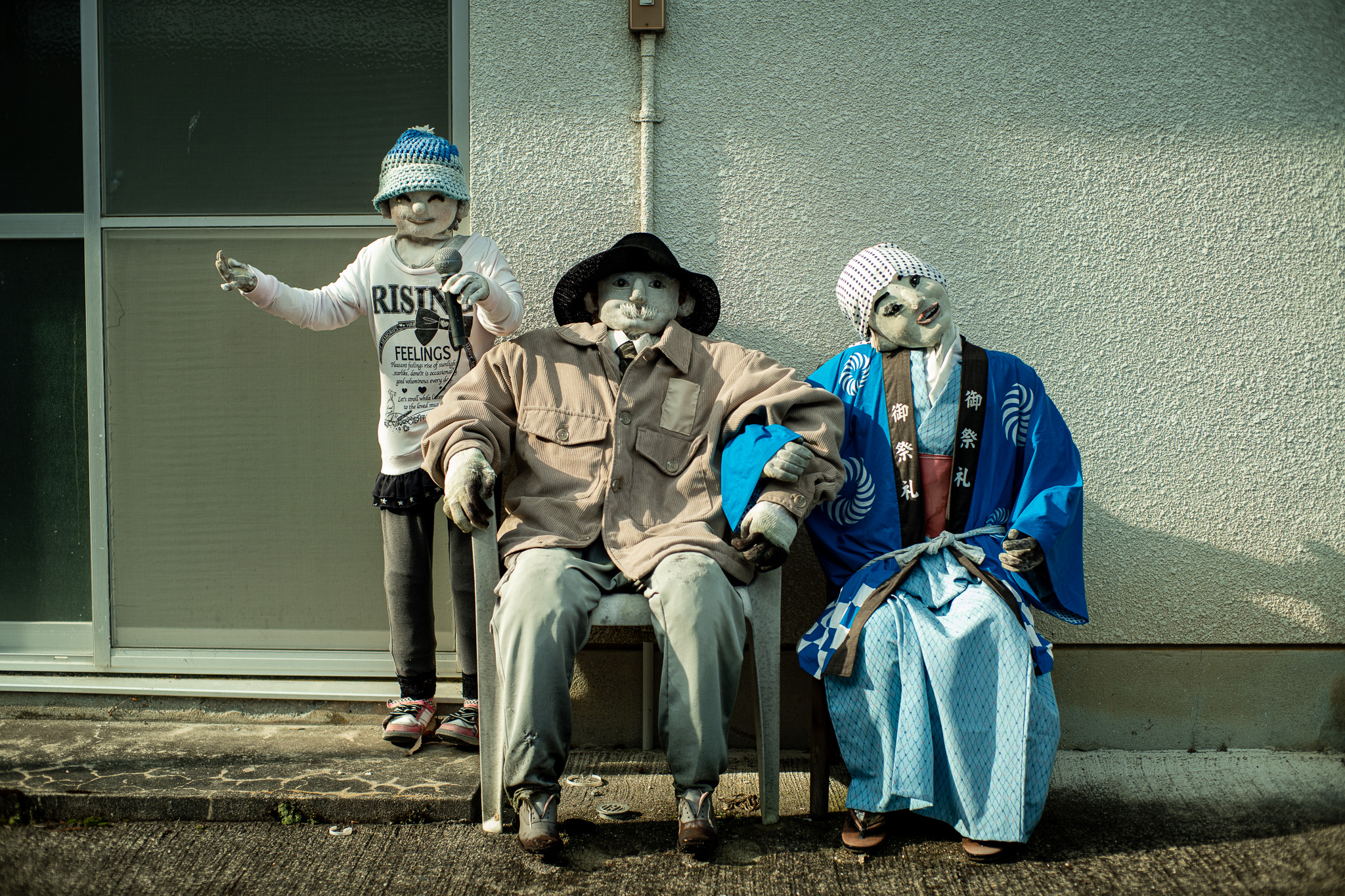 表情、服装、姿勢。 単なる人型ではなく、「誰か」に見える造形が増えていった。 農作業着を着た老人、通学途中の子ども、 縁側に腰掛ける住民の姿。 かかしは抽象的な存在から、具体的な人物像へと近づいていく。