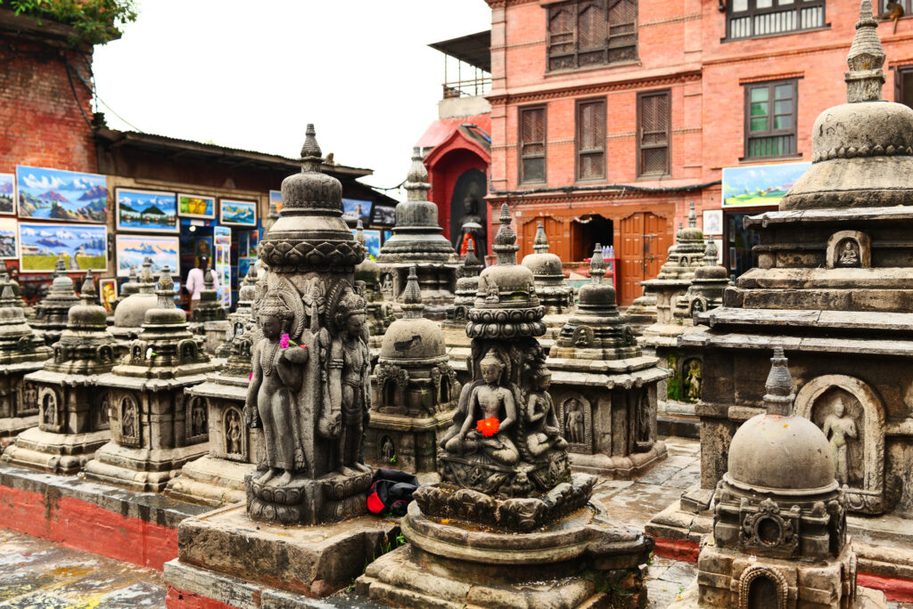 その後、マッラ王朝(12〜18世紀)の時代になると、スワヤンブナートはさらに拡張・装飾されていく。 周囲に増築された祠堂やヒンドゥー教の神々の像は、この時代の宗教観を色濃く反映している。 ネパールでは、仏教とヒンドゥー教が対立するのではなく、同じ空間に並存し、重なり合って信仰されてきた。 スワヤンブナートは、その混交性を最も端的に示す場所の一つだ。
