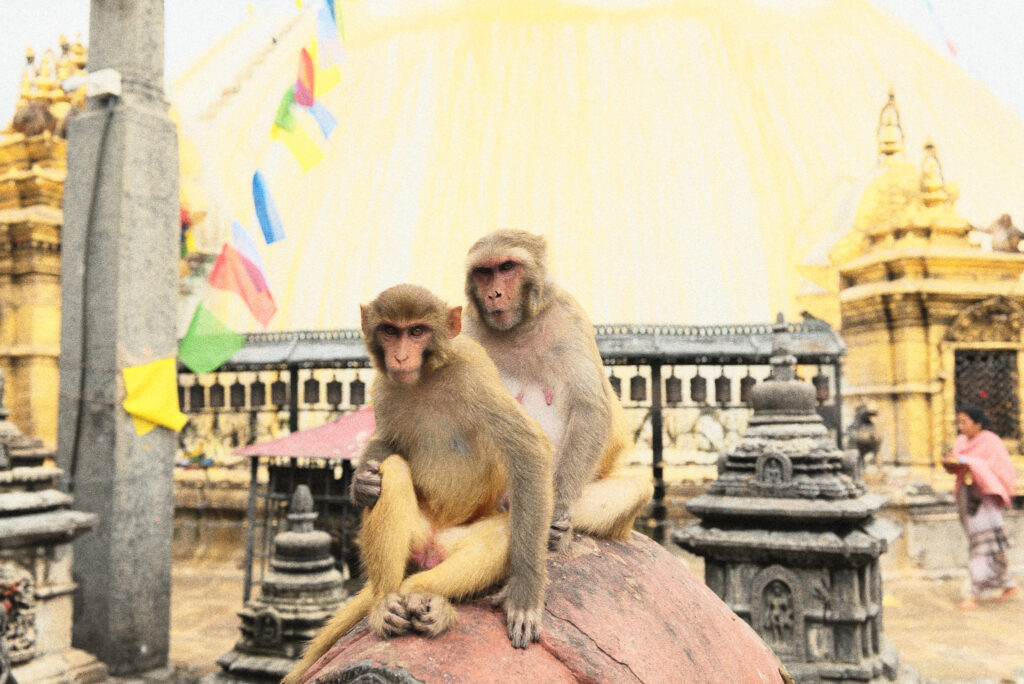 ネパールの宗教観において、サルはしばしば混沌や欲望、人間性の写し身のように捉えられる。 欲しいものを奪い、衝動的に動き、秩序を乱す存在。それは人間自身の姿と重なって見える。 だからこそ、完全に否定されることも、理想化されることもない。