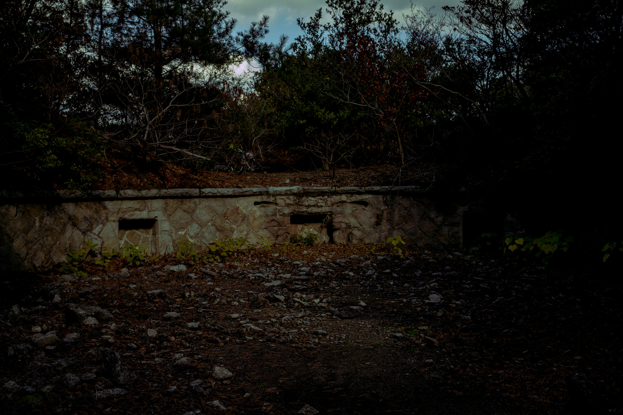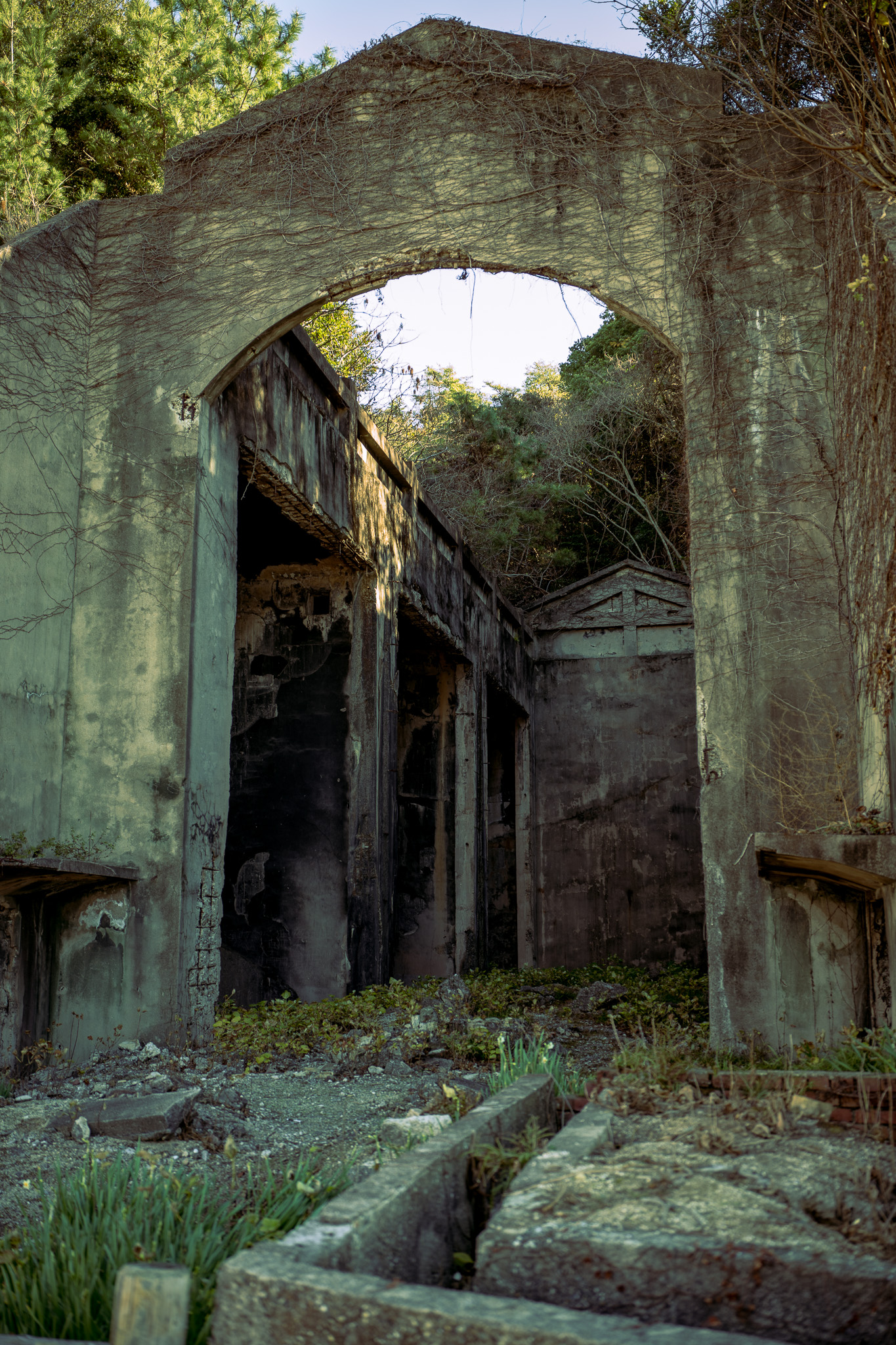 1950年代以降、島は事実上の無人状態となり、長い空白の時間を迎える。赤煉瓦の建物やコンクリートの構造物はそのまま残され、風雨にさらされながら徐々に朽ちていった。草木が伸び、壁面を覆い、軍事施設は自然に取り込まれていく。人の気配が消えた島には、静寂だけが広がっていた。