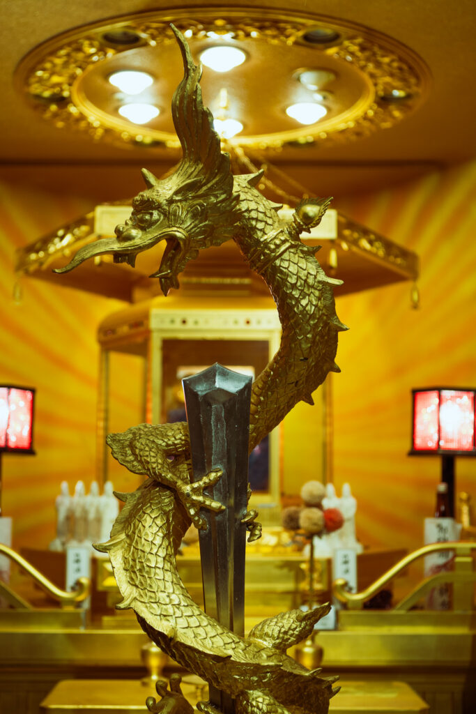 胎内の中心的な象徴が倶利伽羅剣である。倶利伽羅剣は不動明王と深く結びついた密教的象徴で、剣に龍が巻き付く姿で表される。これは煩悩を断ち切る力を視覚化したものであり、破壊ではなく、救済のための剣を意味する。