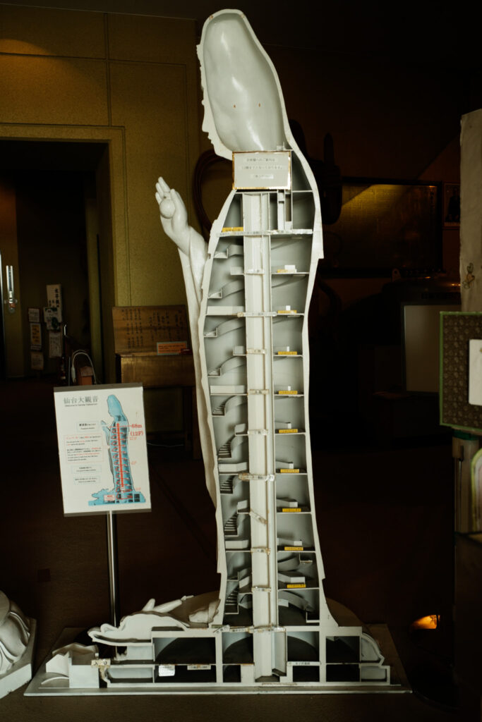 この内外の対比が重要である。外観は象徴的で圧倒的だが、胎内は内省的で、修行的な空間だ。仙台大観音は単なる巨大な像ではなく、密教的修行の場として設計された、立体的な信仰空間といえる。