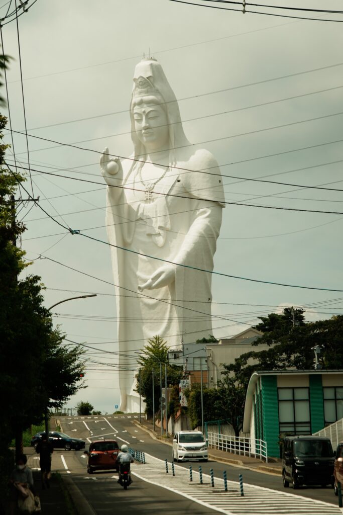 仙台市泉区の住宅街。その先に、突然、白い巨大な観音像が姿を現す。なぜこのような巨大観音が、閑静な住宅街のすぐそばに立っているのか。仙台大観音と呼ばれるこの像は、高さ約100メートルを誇り、市内の広い範囲から視認できる存在だ。所在地は宮城県仙台市泉区実沢字中山南。観光名所として知られながらも、その印象は「訪ねて会いに行く仏像」というより、日常の風景に紛れ込む異物に近い。初めて目にした者は、その唐突さとスケールに強い印象を受ける。
