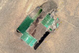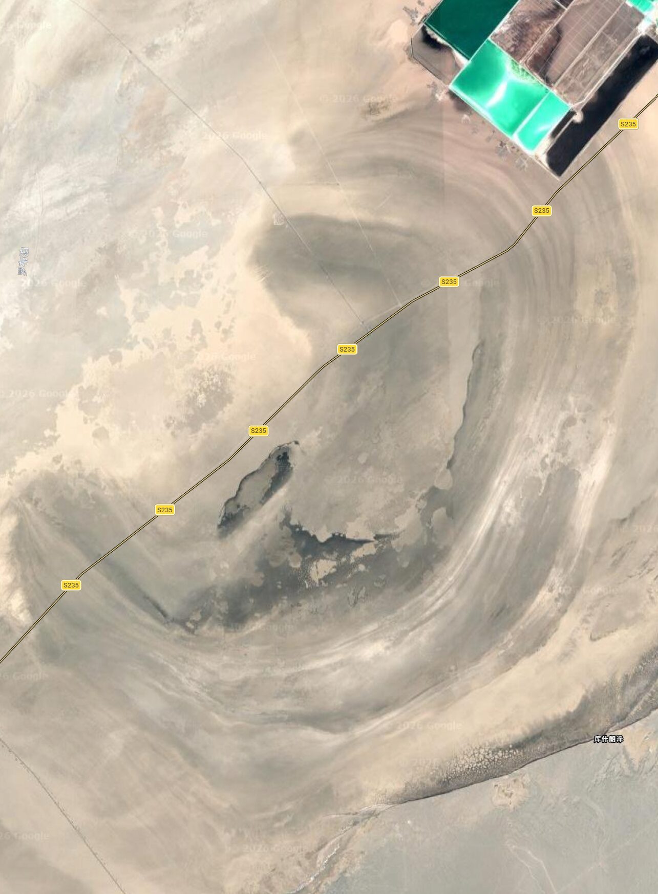 ところが、衛星写真に切り替えた瞬間、歪な湖、あるいは干上がった塩田のような地形が唐突に現れる。